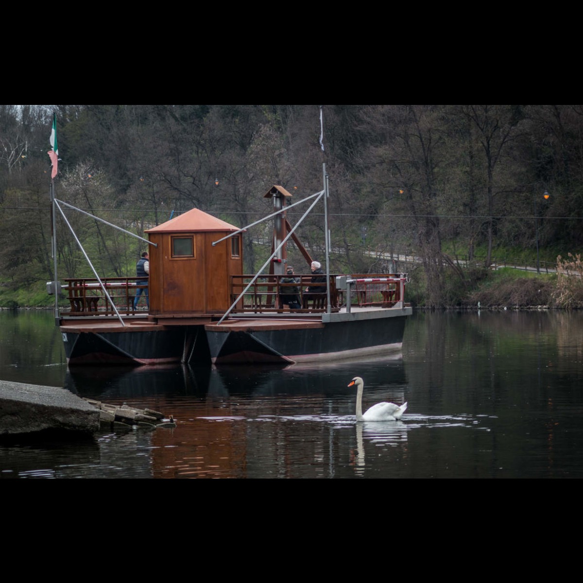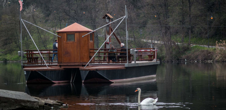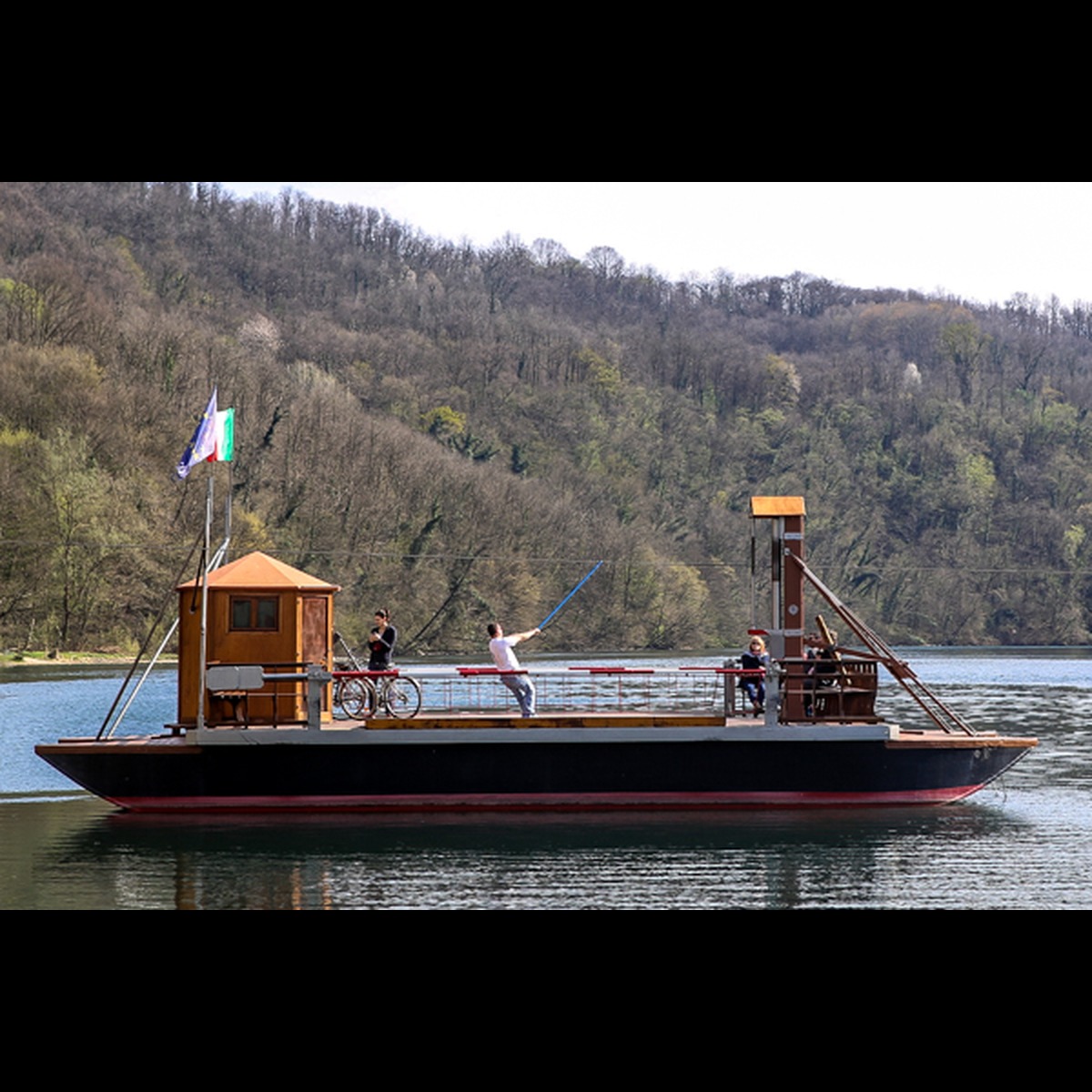 La forza della corrente viene contrastata degli scafi e da una fune guida fissa che collega le due rive opposte del fiume, creando così un movimento laterale che consente lo spostamento del traghetto con la sola corretta manovra dei timoni.